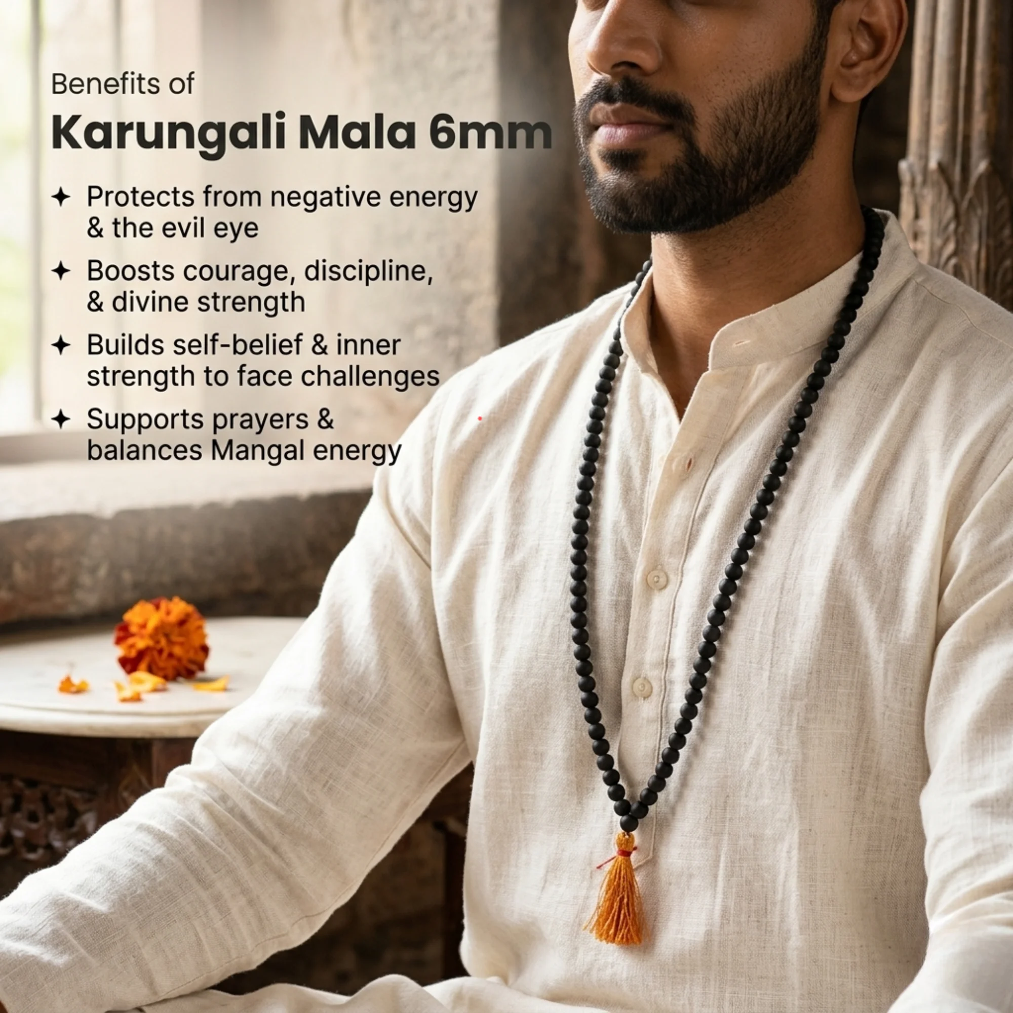 Karungali wood is believed to create a strong protective shield around the wearer, helping to reduce the impact of negative influences such as jealousy, stress, and unwanted energies. It is also associated with balancing Mars (Mangal) energy, which can help manage anger, impulsiveness, and emotional instability.